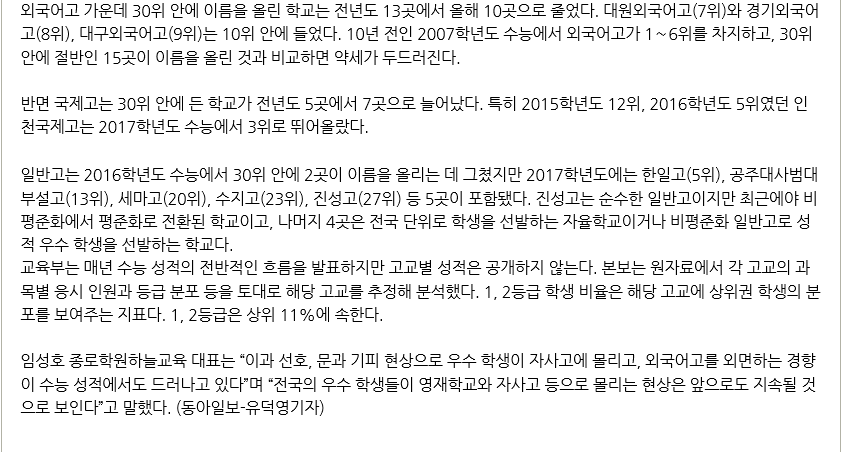 The result of 2017 College Scholastic Ability Test analysis involving 2,430 of high schools across the nation proves that autonomous private high schools outperformed their general high school counterparts, placing them in the top-tier of the overall 30, whereas only one general high school ranked in the top 30.