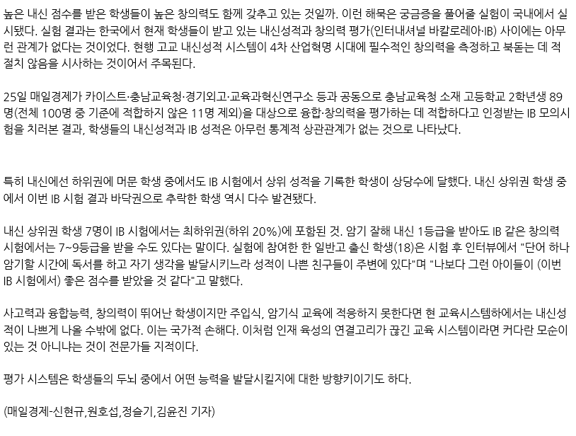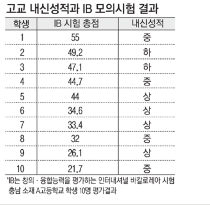 at the top of the current schooling system performed poorly. The result of the research shows that students’ scores under the current schooling, centered at university entrance exams have nothing to do with IB (International Baccalaureate Diploma Programme) scores aiming at boosting creativity and an interdisciplinary approach to learning.
